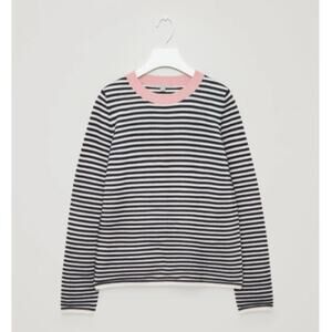 A casual striped style, this long-sleeve top is made from light, fine-knit wool with a textured garter-stitch quality. Loosely fitted, it is completed with a bold, ribbed collar in a contrasting colour and clean tubular trims.