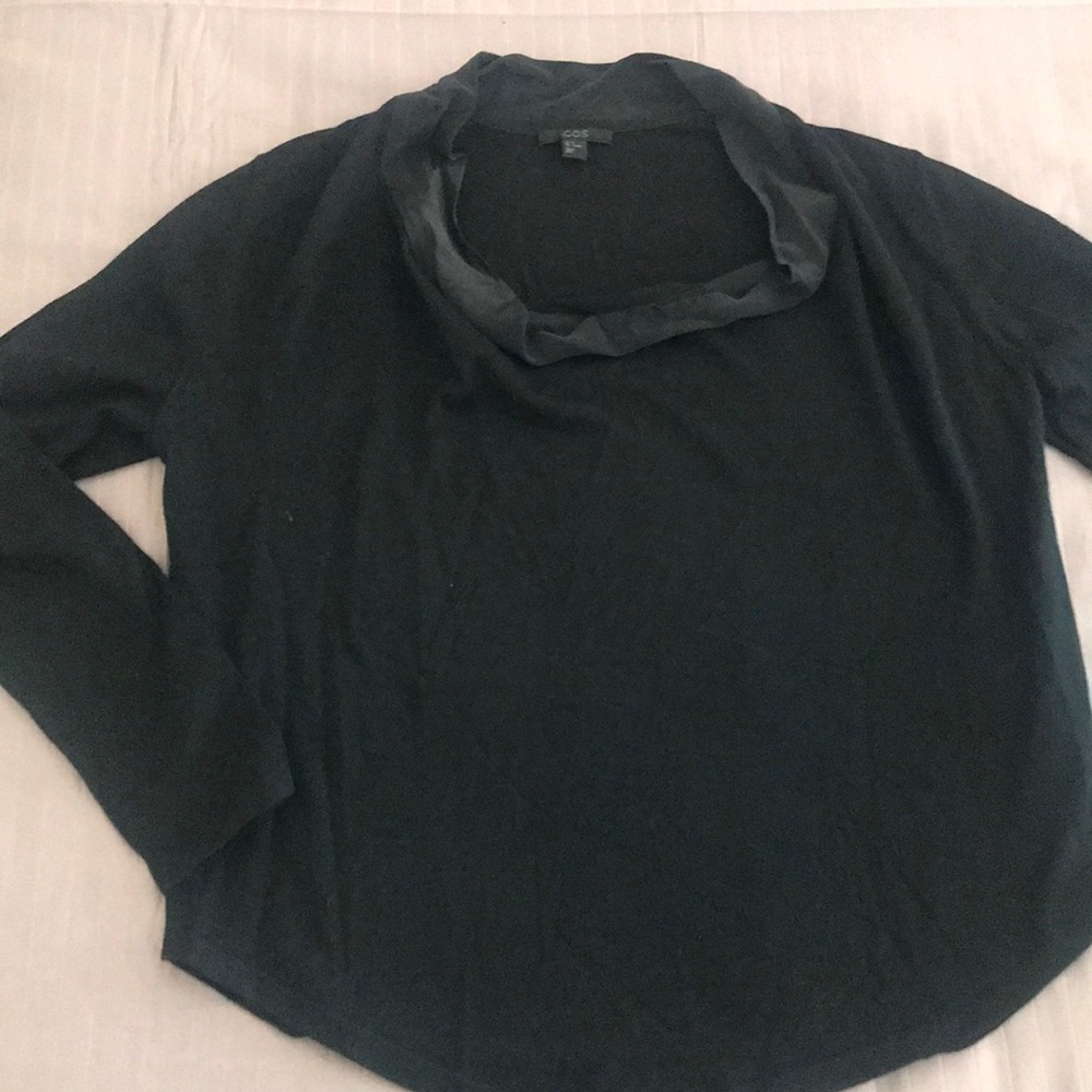 Light jumper from COS. Cute, silky, cowl neckline detailing, resulting in a slouchy, classy look. Good for a casual day tucked into jeans, or dressed up for the office with a pencil skirt. Body is 100% wool // Neckline is 100% silk. Worn once.