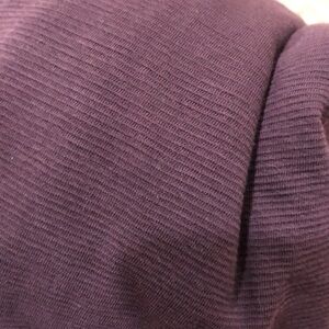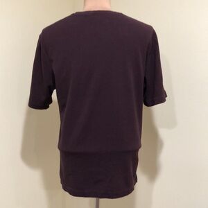 Very good condition no stains rips or thinning. Some very slight fading throughout. Short sleeve, crew neck, relaxed fit T-shirt. Multi-directional fine ribbed knit in very dark purple.