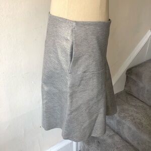 This skirt is made from a jersey material with a shimmering, foil finish. A short, A-line style, it has a comfortable elastic waistband and a raw-cut hem. Pull On styling. 2 Side hidden pockets. Thick Knit 62% Rayon 38% Nylon. In excellent used condition. Approximate measurements laying flat: 14” waist, 17” length. Inventory: a35teb*m