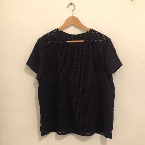 Really cool navy top from COS, size Medium. The front side of the shirt is felt material and has small rectangles cut out of the fabric throughout. It's sexy without revealing too much. Looks awesome with a black bra or tank underneath. Back of the shirt is nylon material, has a zipper detail even though the shirt is pull-on style and fits over your head. Purchased at a Cos in London, never in the US stores! One of a kind item, really stands out. Gently pre-owned in great condition.