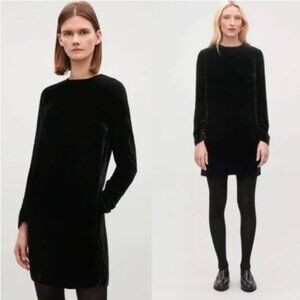 COS Velvet Long Sleeve Dress Solid Black Ruched SILK BLEND Fall Mini Shift Dress