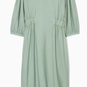EUC COS dress in a soft light green, size 6. This voluminous midi dress features a flattering V-neckline, delicate puff sleeves, and a gathered waist that creates a graceful silhouette perfect for wedding guests. Crafted from lightweight, sustainable TENCEL™ Modal blend fabric, it’s breathable and comfortable for all-day celebrations. Unlined with a concealed zip closure, this dress combines understated elegance with effortless femininity — ideal for summer weddings and special occasions.