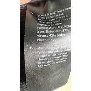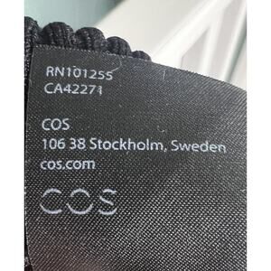 The product is a COS Women's Large Black Stretch Knit Ribbed Mock Neck Short Sleeve Mini Dress. This stylish dress is perfect for various occasions like parties, formal events, or business meetings. Made from a blend of spandex and viscose, the dress features a bodycon style with a solid black color and a mock neck neckline for a chic look. The pullover closure and knit fabric make it easy to wear and care for with machine washable instructions. Whether it's for winter, summer, fall, or spring, this designer dress is a versatile and classic addition to any wardrobe.