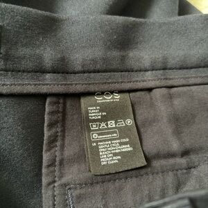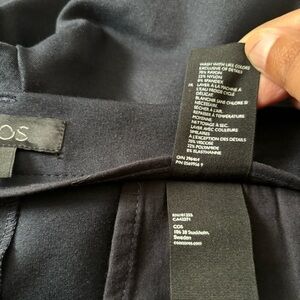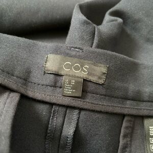 COS Women's Blue Ankle Zip Skinny Pants are made of machine washable viscose material with a solid pattern. These pants have a flat front, high-rise waist, and a skinny leg style with a 29-inch inseam. They feature stretch, pockets, and ankle zips.