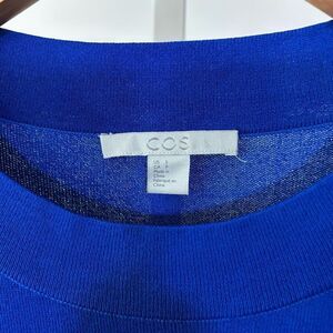This COS dress features a classic sheath style in a vibrant blue, perfect for casual or work settings. The 3/4 sleeves and crew neckline offer a timeless look, while the midi length adds a touch of elegance to your everyday wardrobe.