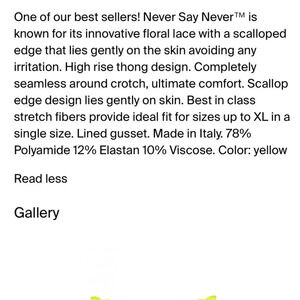 Set of four Never Say Never lace thongs. The 2 Cuties are Jelly and Bright. The 2 Booties are Shocking Pink. Bootie has a slightly higher rise than the Cutie.
