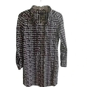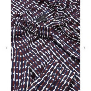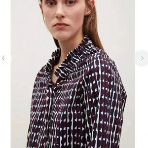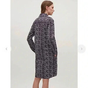 This dress is made from crisp cotton poplin with a bold, geometric print. A straight fit, it has a tunnel collar with a neck tie, shirting cuffs and hidden pockets.