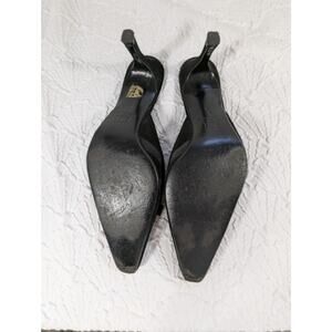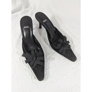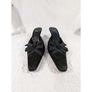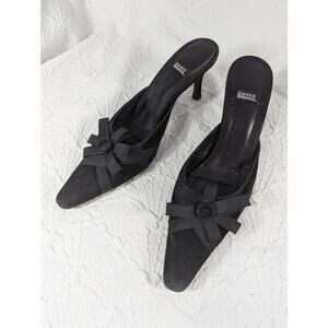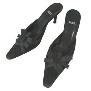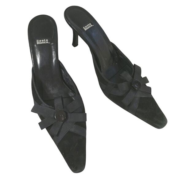 Absolutely and uniquely gorgeous; these heels, slides, mules are from Costa Blanca! In black genuine suede leather, they feature slip on ease and a front ribbon and button "bow" detail! Made in Spain, all leather with a leather sole! Heel- 3.25", Size 9N, Excellent! Superb EUC Condition! **ABSOLUTELY GUARANTEED CONDITION: EUC MINTY-EXCELLENT TO LIKE-NEW, by Lily @HauteClub!*** *Measurements always available on request!*