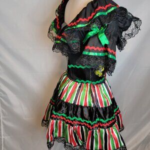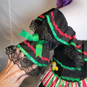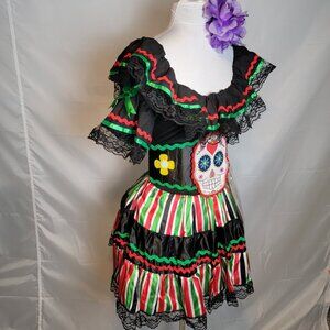 COSTUME, "DAY OF THE DEAD DOLL" COSTUME, size small , dress and belt included, very colorful w/ adjustable belt and dress with elastic waist and shoulder and bust area.