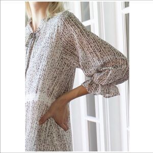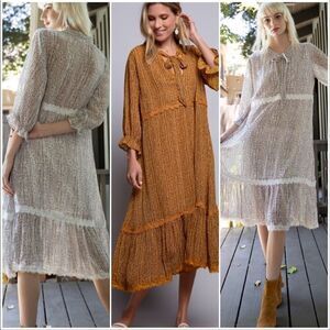 Boho inspired woven Dress Featuring A Shaped looses body with 3/4 Sleeves; Lace Trimmed On Body; Low V Neck with Trim Detail on edge and finished with Adjustable Tie On Front. Lined