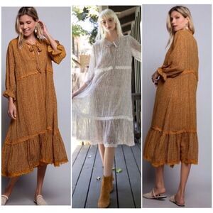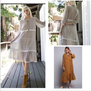COTTAGE Core A Shape Lace Trimmed Dress w/ 3/4 Sleeves