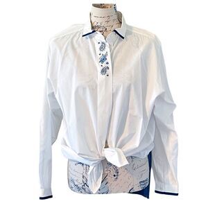 Long sleeve button up white blouse with shades of blue embroidery by Portraits by Northern Isles. Features hidden button front, slight gathering detail at cuffs and along back shoulder seam, a beautiful blue flowers & paisley on the embroidery.Perfect for cottagecore or grannycore styles. Size 16. Pre-owned, excellent condition.