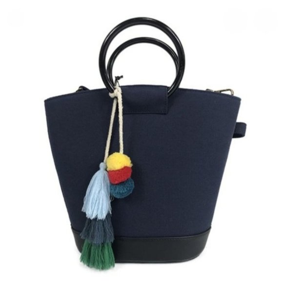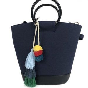 New stylish and fun flourish cotton bucket bag featuring round handles and a faux-leather crossbody strap.