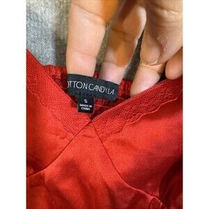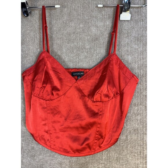 This is a Cotton Candy brand cropped cami in red satin fabric, designed for women in a size small. It features a smocked stretch back and a side zip closure. The style of the cami is tank with a regular fit.
