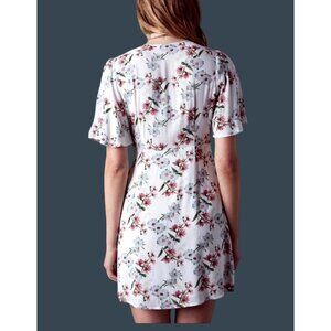 This Cotton Candy LA floral mini dress in white for women is perfect for any casual occasion. The dress features a tye front, short sleeves, and a side zipper. It's lightweight, fully lined, and size small.