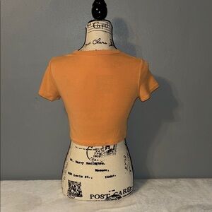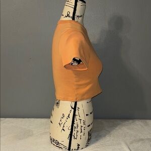 This vibrant bright orange crop top from Cotton On features a crew neckline, short sleeves, and a fun graphic design of two cherries in shades of red with green stems and leaves. Perfect for adding a pop of color to your casual wardrobe.