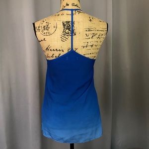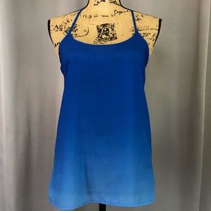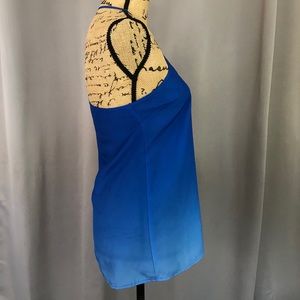 Ombré tank in varying shades of blue. Features a T-strap back.