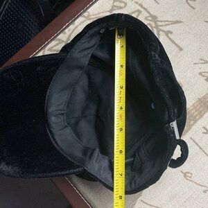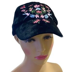 Women’s new black velvet Kiel embroidered cap Circumference approximately 16”. New never worn. Black velvet with a burst of embroidered florals. Adjustable back strap with hidden strap compartment. A must have