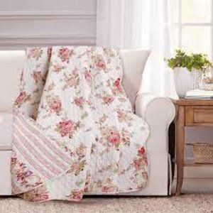 Floral cotton throw, coverlet, with a vibrantly patterned stripe motif, and charming quilted details.