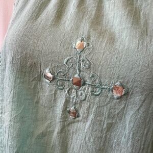 Brand unknown, womens size Medium, 100% cotton, mint green color, semi sheer, long sleeves with tie detail, embroidered and beaded bodice detail.