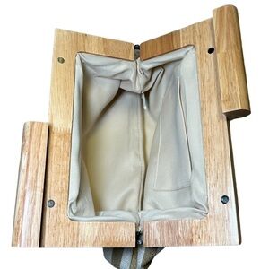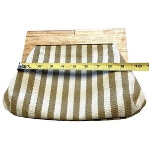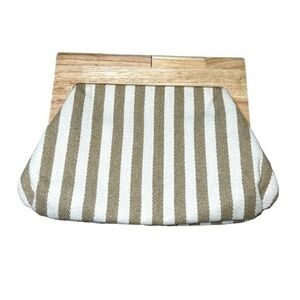 COTTON WHITE TAN STRIPE WOODEN HANDLE CLUTCH BAG PURSE