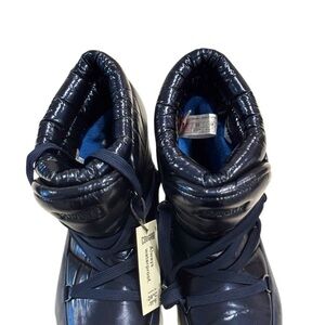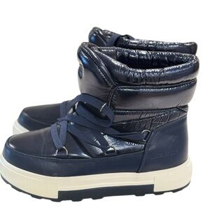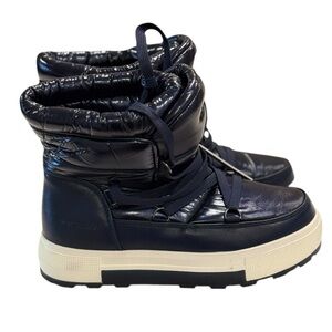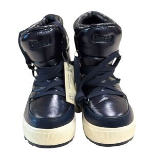 These Cougar winter boots feature a deep navy blue color and are made from a shiny, puffy synthetic material for a glossy look. They have a thick off-white sole for excellent traction and a cozy polar fleece insulation.