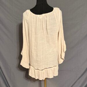 The COUNTERPARTS Peasant Blouse in size XL is a solid tan blouse with long sleeves and a round neckline. It features a pullover closure and a regular fit, perfect for a basic peasant style look. This blouse is designed for women and is a versatile addition to any wardrobe, offering comfort and style in one.