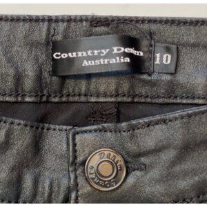 COUNTRY DENIM AUSTRALIA ~ Women's black wax ankle jeans. Size 10. These jeans are mid-rise with a skinny leg and medium stretch. The waxing leaves the denim with a shiny finish.