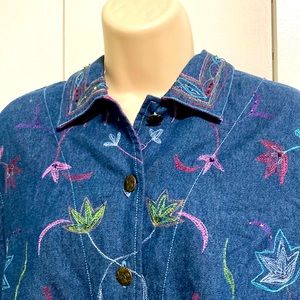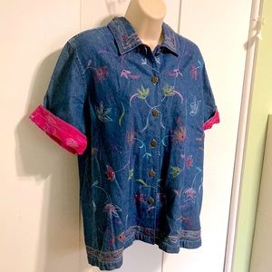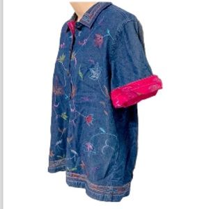 COUNTRY WEAR Vintage Denim Beaded Short Sleeve Shacket Pink Floral Large Petite