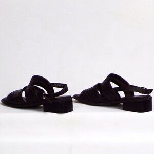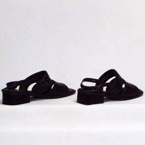 THESE CHIC AND ELEGANT BROWN LOW-HEEL WOVEN-STRAP SLINGBACK SANDALS BY COUP D'ETAT LTD, SIZE 6.5M, are gently pre-owned, in excellent condition. The soles and heel bottoms have light wear (picture #14), and the heel bottoms have some small and shallow pebble gouges (picture #15), but they are otherwise free of defects or damage, with little sign of wear. The insoles are lightly cushioned. The slingback straps have gold-tone metal buckles with 3 settings to ensure a comfortable fit. The uppers are leather, other materials synthetic. They were made in Brazil. The stated size is 6.5M, but prospective buyers are encouraged to compare the measurements with those of shoes that they know fit well prior to purchase. Inside measurements are: length, heel to toe 9"; widest point 3"; narrowest point 1.75". Heel height is 1.5".