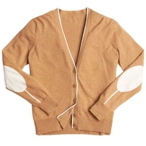 Lightweight buttoned cardigan with a playfully contrasted edge and elbow patch, throw it on over all your favorites. Wear to work or any casual event. True to size.