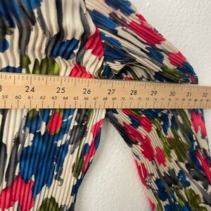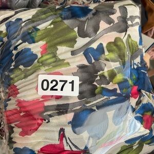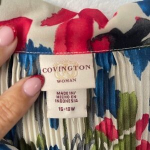 This is a Covington blouse designed for women in plus size 16-18. It features a colorful floral pattern with pleated accents and flutter sleeves, making it a dressy and stylish option for various occasions. The blouse is made of polyester material, offering a comfortable and flowy fit. Perfect for adding a pop of vibrancy and femininity to any outfit, this top is a versatile piece that can be worn anytime.