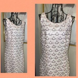MESH COVERED SHEATH DRESS WITH GOLD SEQUINS, WHITE EMBROIDERY OVERALL