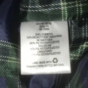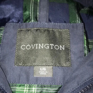 Covington navy blue long sleeve lightweight full zip up windbreaker type jacket. 2 front pockets, elastic at waist and wrists. Outside feels like sued and inside lining is silky feeling.