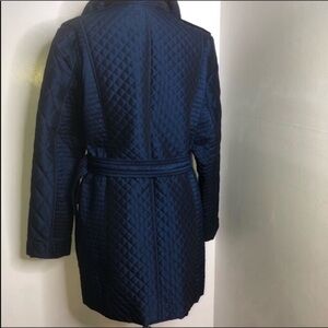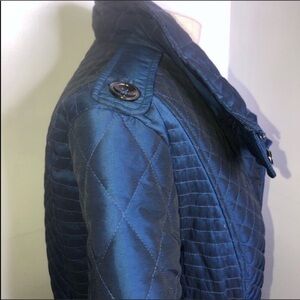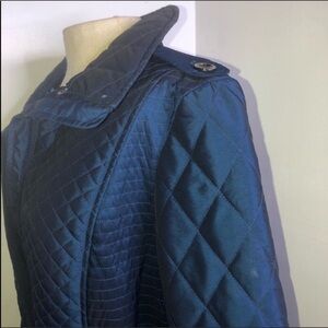 Gorgeous Covington quilted slightly puffer jacket with gunmetal zippers Snaps and buttons gorgeous belt design with aviator lapels stand up collar zip and snap closure double zipper extra button attached inside two large button pockets on front at hips tapered detailing fully lined gorgeous jacket.