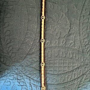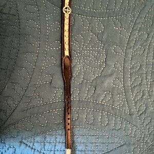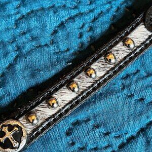 Thin leather hat band for the cowgirl; black leather with silver-toned metal cross conches and a little bit of cow-hide.