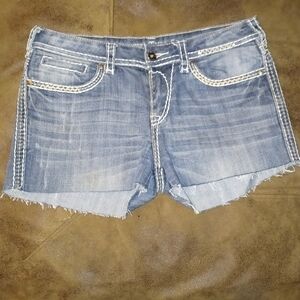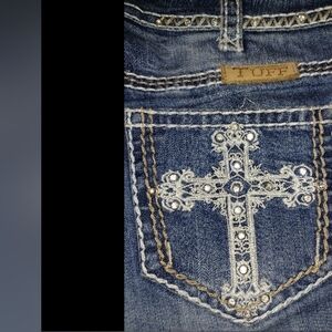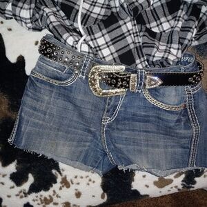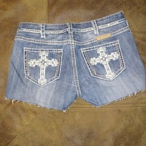 COWGIRL TUFF CO. CUT OFF SHORTS .BLUE JEANS, WITH WHITE CROSSES ON BACK POCKETS. THREADING WHITE AND TAN.