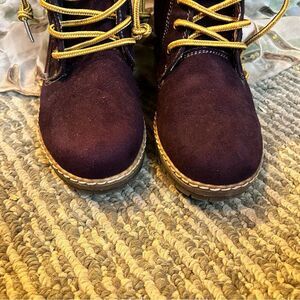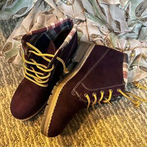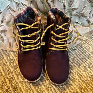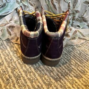 Purple suede outer and plaid lined. Rubber soles. Worn once. Lace up boots. Great for added color to your winter wordrobe.