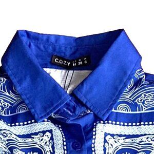 COZY Blue & White Paisley Pattern Button-down Blouse