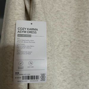Description: semi-fitted with a hem above the knee, cozy fabric with plush interior, asymmetrical zipper.
