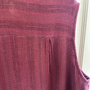 The fabric is a striped homespun texture...it is 70% rayon and 30% flax. Machine washable and dry. There are 5 buttons. The underarm to underarm measurement is 25, center back to hem is 32," and center front to hem is 25." It's classic, casual CP SHADES!