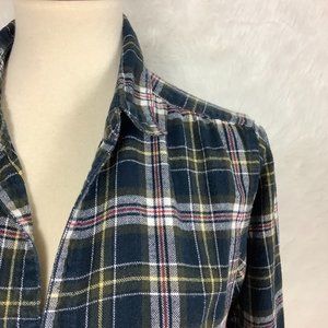This is a v-neck, collared, long sleeve, green, black, yellow, white & red plaid, cotton flannel tunic top or mini dress from CP Shades. Made in USA. Has pockets, button cuffs. No flaws other than overall broken in not new feel. 100% cotton flannel.