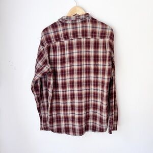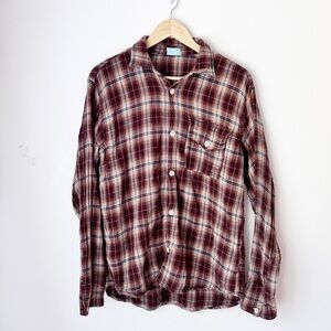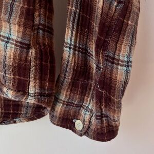 Stylish plaid shirt with button-down front. Brown/cream/blue. Pocket with button closure. 100% cotton. Incredibly soft.
