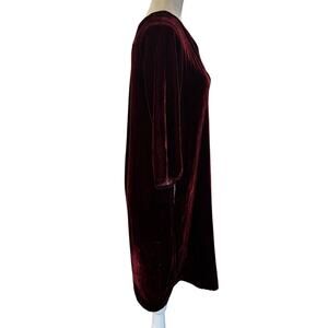 Luxurious CP Shades tunic dress in a rich burgundy velvet. Crafted in the USA from a soft, drapey blend of rayon and silk, this piece offers a relaxed yet refined silhouette with a notched V-neckline and 3/4 sleeves. The plush texture and easy shape make it perfect for layering, dressing up, or lounging in style.