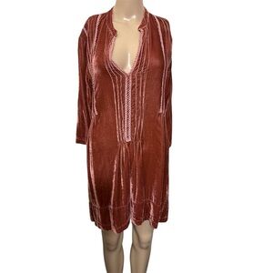 Chic terracotta velvet dress with long sleeves. Features delicate front detailing.