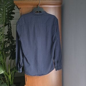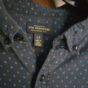 CPO Provisions dark blue button up shirt with pattern. made in india. excellent used condition.