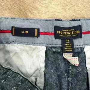 Upgrade your wardrobe with these stylish CPO Provisions shorts in blue/gray. Made of a comfortable blend of lyocell and cotton, these chino shorts feature a flat front and belt loops with a button closure. The size is 33 inches, and the inseam is 10 inches, making it a great fit for casual occasions.