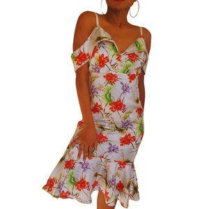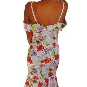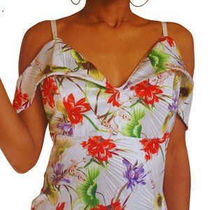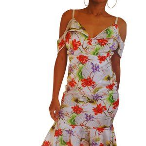 Floral Print Dress with sweetheart neckline, off shoulder sleeves, adjustable straps and ruffled hem. Back zipper with hook & eye. Waist - 26/28. Approx. Length from shoulder to hem - 41 ins. Preowned.