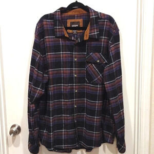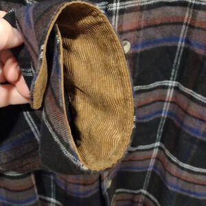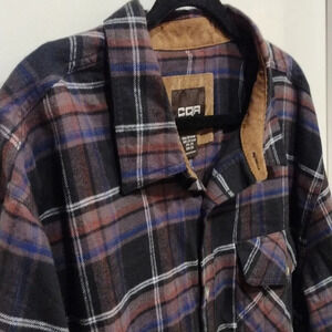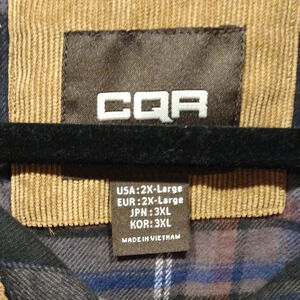 Here's a nice CQR Men's flannel shirt. This is a nice plaid shirt with corduroy trim. It is in good condition. Could be used as a light jacket. Size 2XL